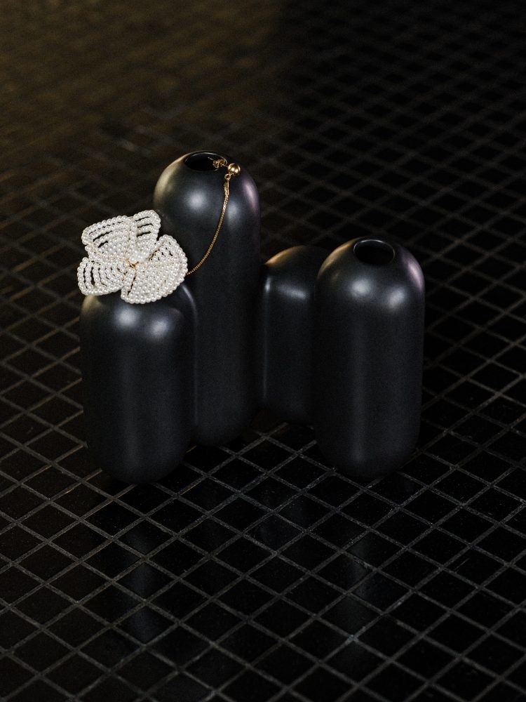 Adoptez l’élégance de la monoboucle PETALS, une fleur de perles conçue à la main au design moderne et sophistiqué. Chaîne et et perle dorée en acier inoxydable.