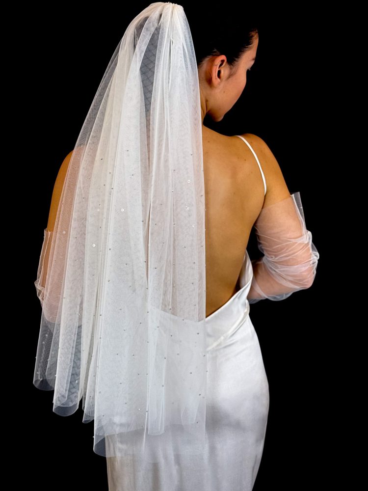 Inspiré par la beauté délicate et l’intensité lumineuse de Romy Schneider, le voile “Romy S.” capture une élégance à la fois simple et sophistiquée. Ce voile court, longueur coude, est confectionné en tulle léger avec une finition double qui lui confère un volume subtil. Orné de broderies de paillettes transparentes et de perles argentées, il scintille avec finesse à chaque mouvement. Pour un look harmonieux et raffiné, ce voile peut être assorti à des mitaines coordonnées, également brodées à la main. Une création idéale pour les mariées qui souhaitent allier modernité et poésie, tout en rendant hommage à une icône intemporelle du cinéma.