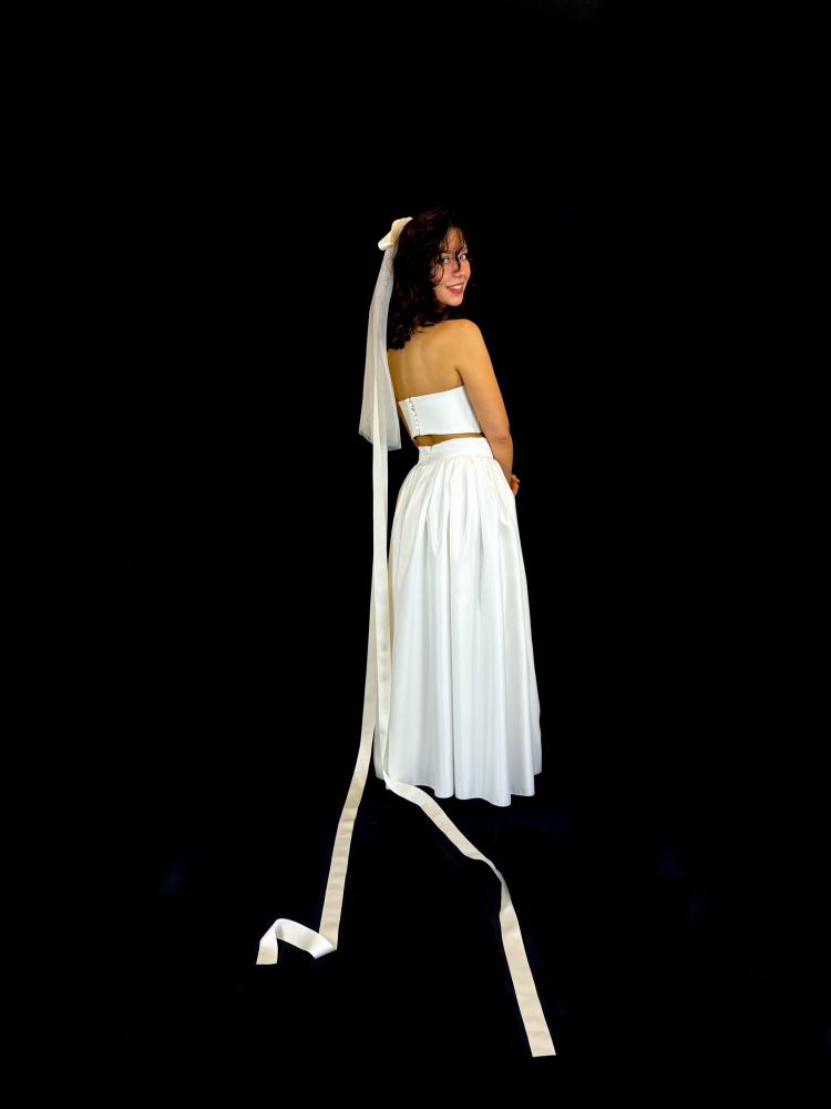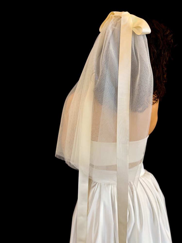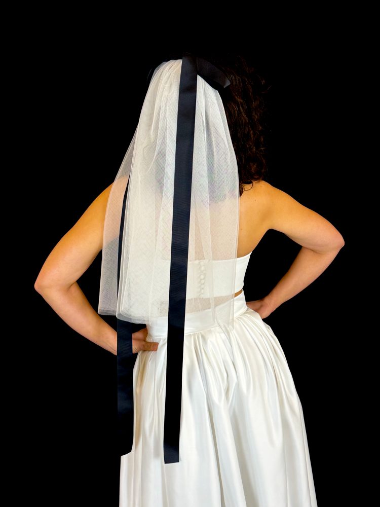 Le voile “Sarah J.P.” rend hommage à la féminité moderne et à l’esprit audacieux de Sarah Jessica Parker. Ce voile court, en tulle fin et doux, apporte une touche de légèreté et de raffinement à la silhouette de la mariée. Son nœud amovible, en gros-grain blanc ou noir, offre la possibilité de jouer avec deux styles différents : un nœud long et élégant pour un look intemporel ou un nœud plus court et audacieux pour un côté plus moderne. Ce voile versatile, tout en douceur et sophistication, incarne l’esprit libre et chic de l’icône de la mode. Un choix parfait pour celles qui souhaitent allier modernité et charme délicat.